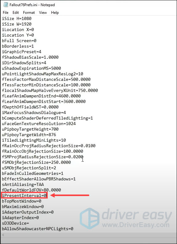 - Use the shortcut key Ctrl+F to search the word ‘iPresentInterval‘. Then change “iPresentInterval=1” to “iPresentInterval=0“. This will turn off VSync.