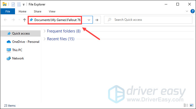 - On your keyboard, press the Windows logo key and E at the same time to open File Explorer. Then type Documents\My Games\Fallout 76 in the address bar.