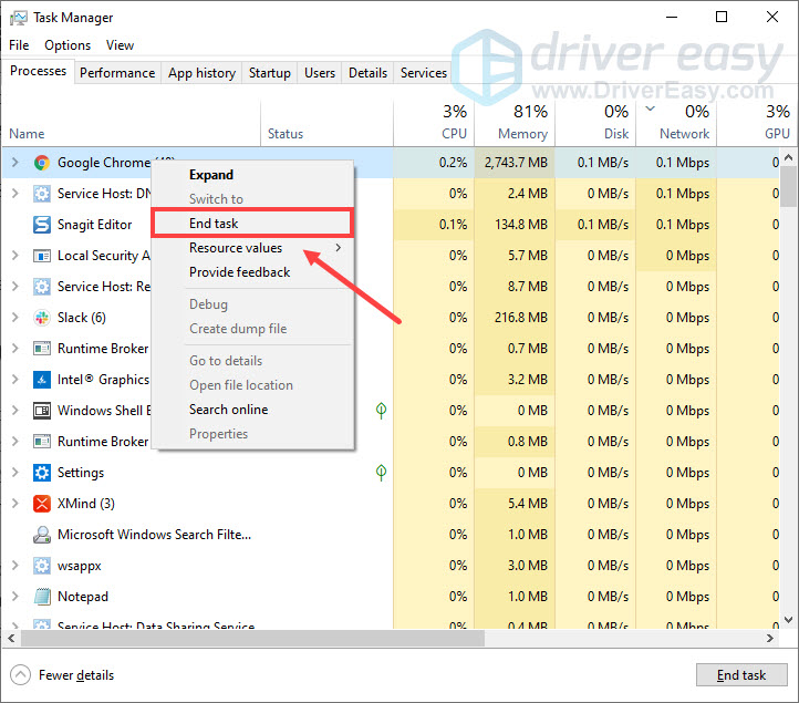 - Once at a time, right-click the CPU and RAM heavy program (like Chrome and Discord) and select End task to close it.