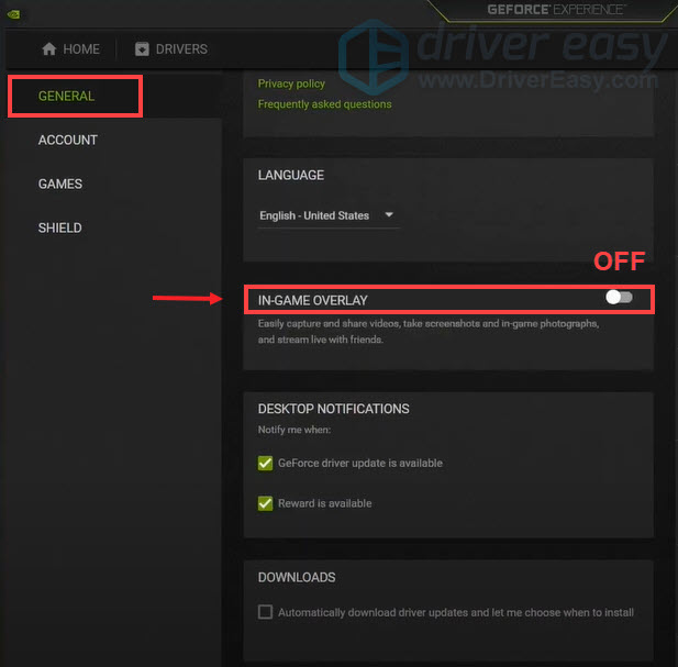 - In the GENERAL tab, scroll down and switch IN-GAME OVERLAY to OFF.