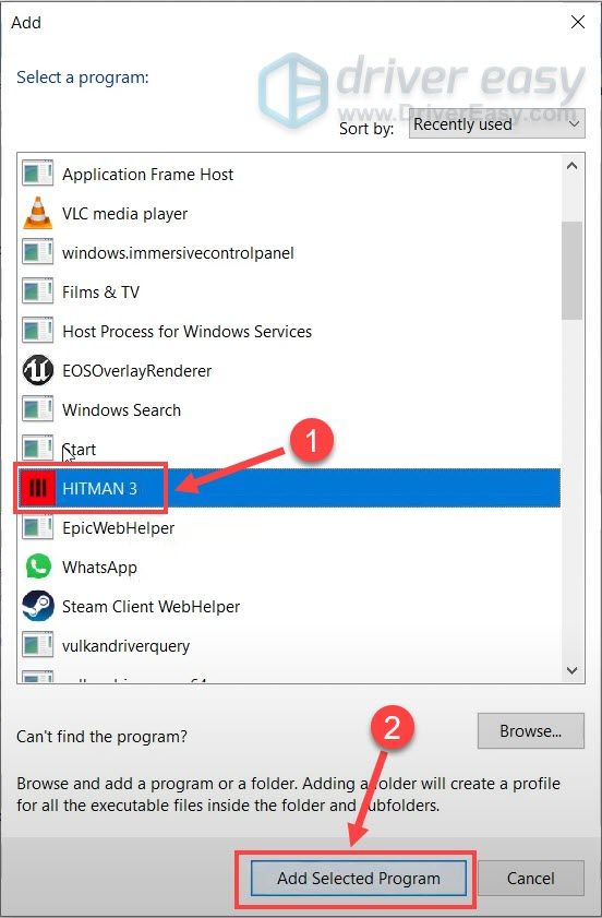 - Select HITMAN 3 from the list and click Add Selected Program.