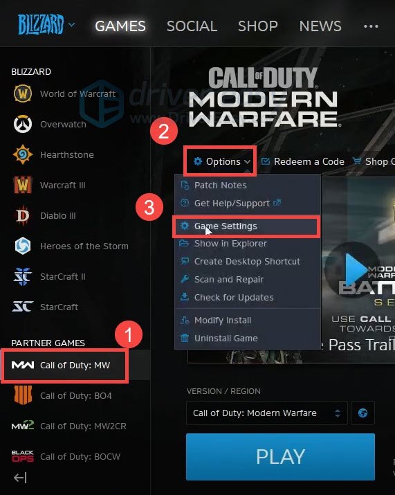 2. From the left menu, select Call of Duty: MW and click Options > Game Settings.