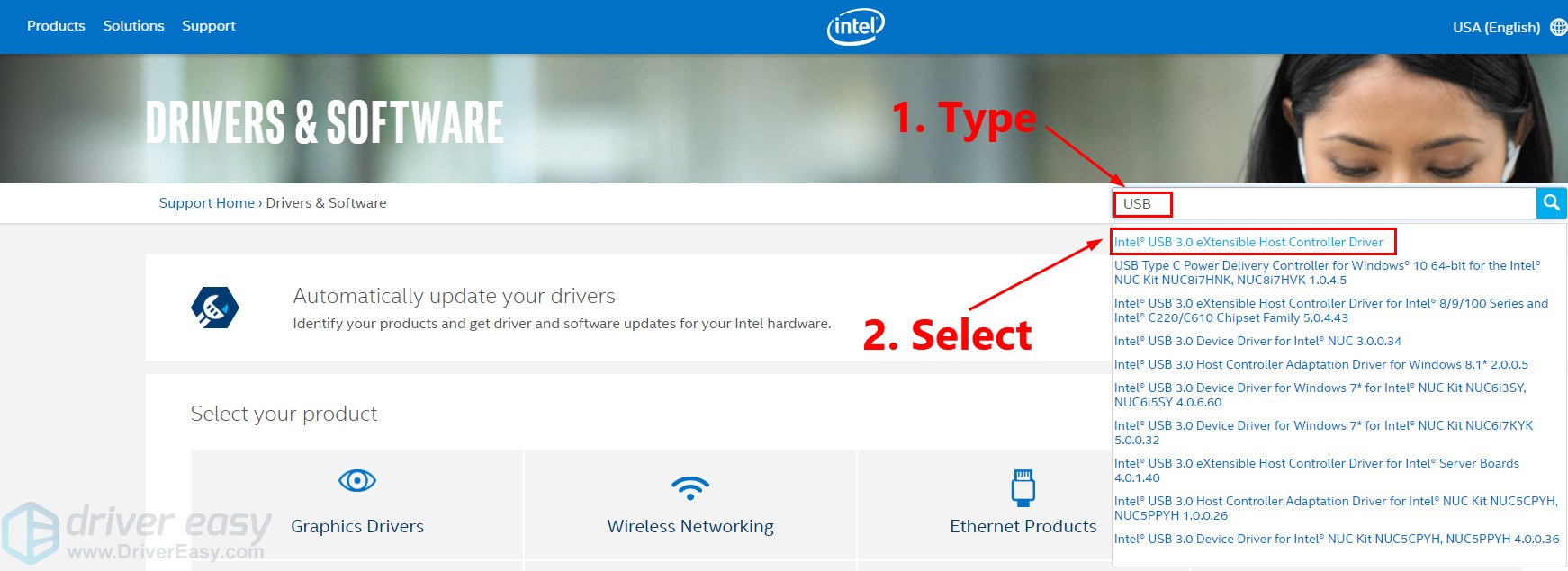 2. In the search bar, type USB and select Intel® USB 3.0 eXtensible Host Controller Driver.