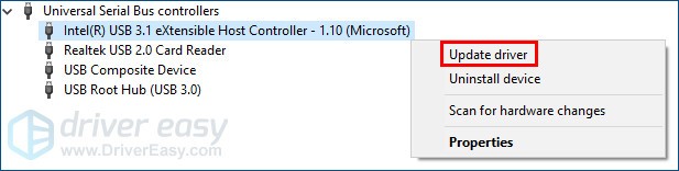 2. If your PC is running Windows 10, double click Universal Serial Bus controller to expand the list, right-click Inter(R) USB 3.1 eXtensible Host Controller (or USB 3.1 eXtensible Host Controller) and then click Update driver.