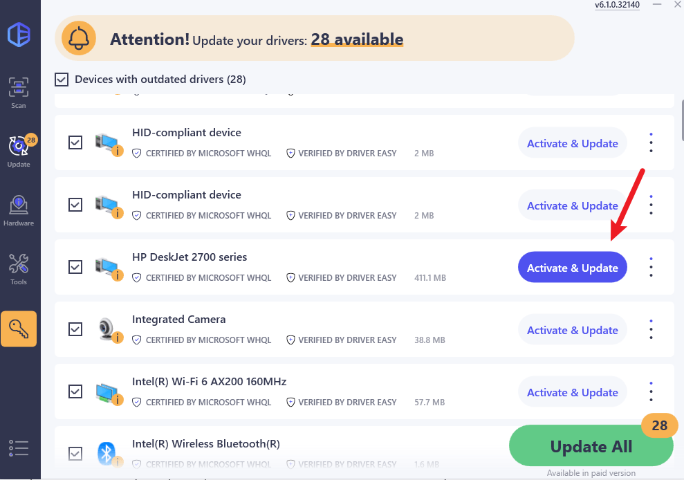 - Click the Activate & Update button next to the flagged device to automatically download and install the correct version of this driver.