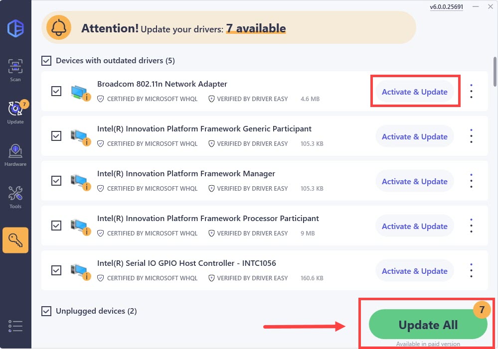 (This requires the Pro version which comes with full support and a 30-day money-back guarantee. You’ll be prompted to upgrade when you click Update All. If you’re not ready to buy the Pro version, Driver Easy offers a 7-day free trial which includes access to all the Pro features such as high-speed download and one-click install. You won’t be charged anything until your 7-day trial has ended.)