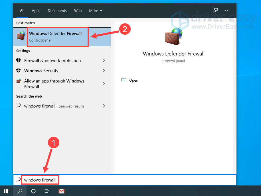 - Type windows firewall in the search box and click Windows Defender Firewall.