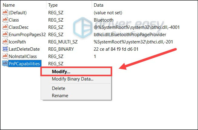 4. Rename the new entry to PnPCapabilities. Right click it and select Modify…