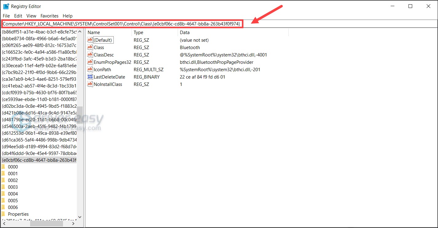 2. In address bar of the pop-up window, type or paste Computer\HKEY_LOCAL_MACHINE\SYSTEM\ControlSet001\Control\Class{e0cbf06c-cd8b-4647-bb8a-263b43f0f974} and press Enter.