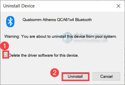 3. In the pop-up window, check the box next to Delete the driver software for this device. Then click Uninstall.