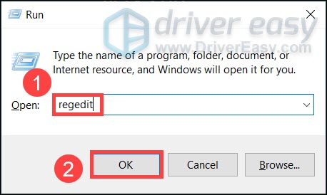 1. On your keyboard, press Win+R (the Windows logo key and the R key) to invoke the Run box. Type regedit and click OK.