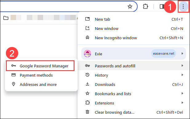 1) Click the three-stacked-dots icon at the top right corner of your Chrome browser. Place your cursor over Passwords and autofill and then select Google Password Manager from the menu.