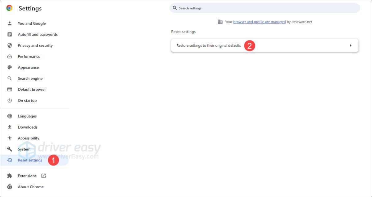 2) Select Reset settings and then click Restore settings to their original defaults on the right.