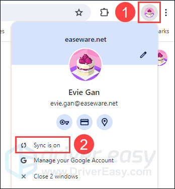 1) Click your profile at the top right corner of your Chrome browser. Then select Sync is on.
