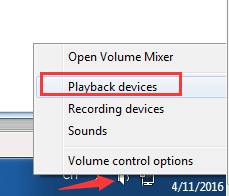 - Right-click the sound icon at the bottom right corner of your desktop and click Playback devices.