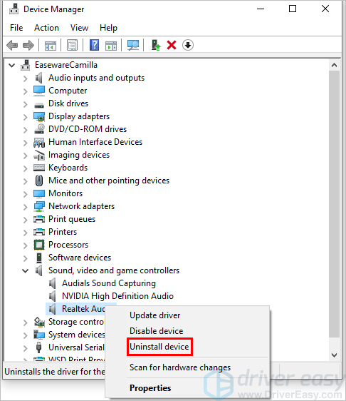 3) In Device Manager, expand Sound, video and game controllers. Right-click on Realtek High Definition Audio (in some Windows versions, this could be Realtek Audio) and select Uninstall.