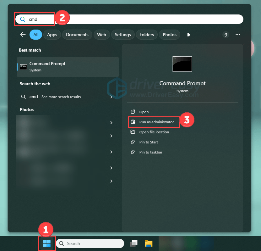 1) Press the Windows key on your keyboard, then type cmd (DON’T press Enter). Windows will display a list of programs that match your search. Right-click Command Prompt and choose Run as administrator.