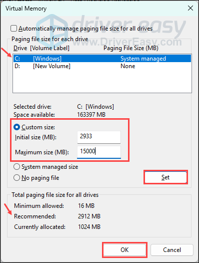 Once you’ve entered your virtual memory values, click Set, then click OK to continue.
