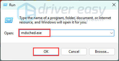 1) On your keyboard, hold the Windows logo key and press R at the same time to invoke a Run command. Type mdsched.exe in the run box and hit Enter.