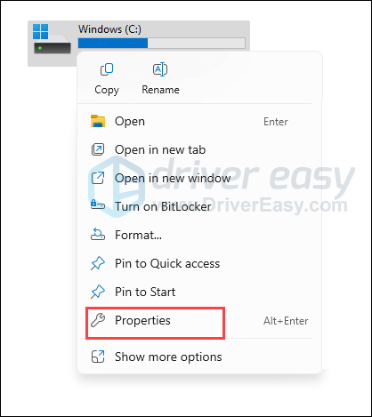 3) Locate the hard drive you’d like to check, right-click on it and choose Properties.