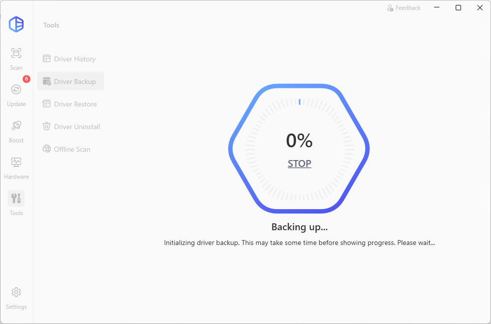We’ve refined the driver backup interface. If there’s a delay before progress appears, the outer ring now animates smoothly, preventing the UI from looking frozen at 0%.