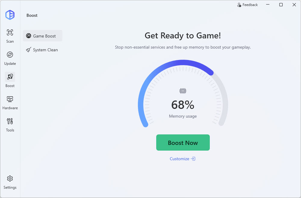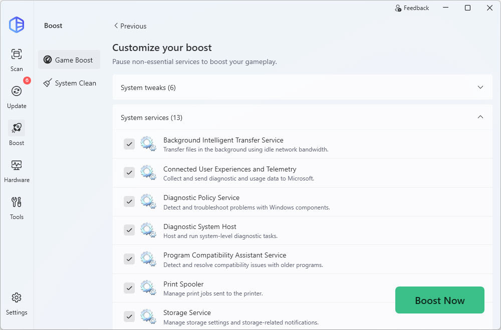 With Game Boost, you can customize which optimizations to apply—choose from up to 13 non-essential Windows services and six system tweaks, including freeing up RAM, clearing clipboard memory, enabling Game Mode, adjusting power settings, and disabling telemetry and the Windows key. All changes are automatically restored when you exit Game Mode.
