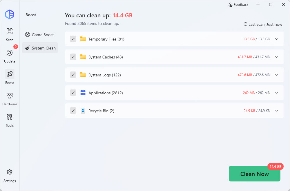 Introducing System Clean, found under the Boost menu. With administrator privileges, this feature enables you to remove system junk, including temporary files, caches, logs, and items in the Recycle Bin. It also supports cleaning data for Microsoft Edge and Google Chrome. This keeps your PC tidy, frees up valuable disk space, and ensures your system stays in top shape.