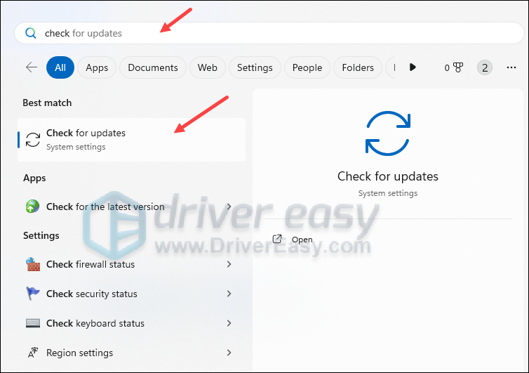 - On your keyboard, hit the Windows key, then type check for updates, then click Check for updates.