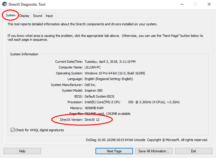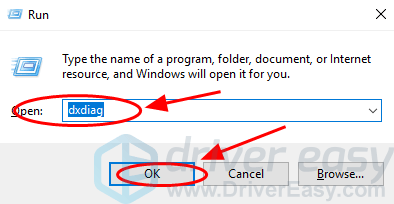 - On your keyboard, press the Windows logo key and R at the same time. Type dxdiag and click OK.