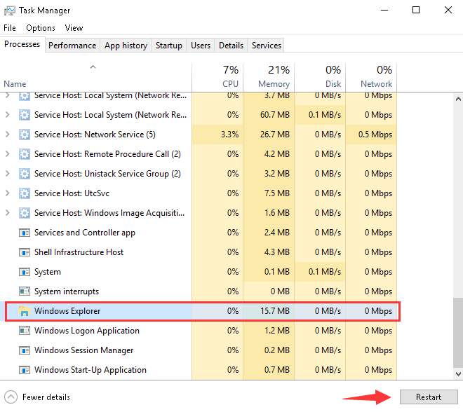 2. In Processes tab, select Windows Explorer and click on Restart button.