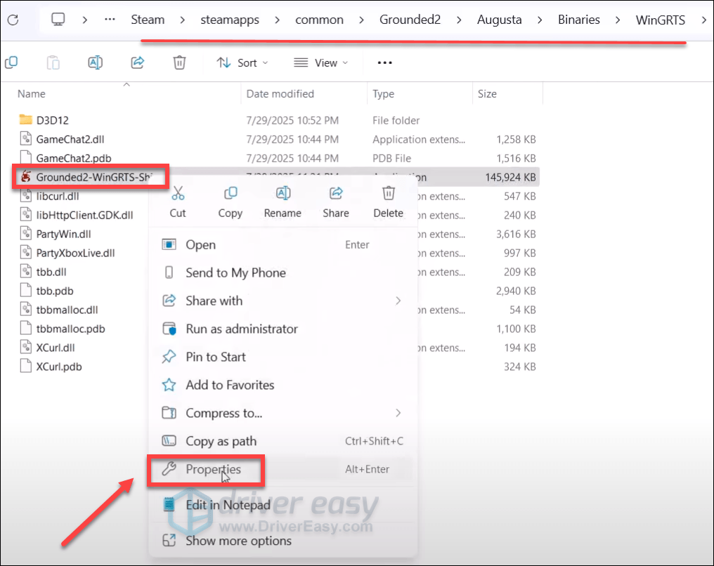 - Navigate to Grounded 2> Augusta > Binaries > WinGRTS. Find the Grounded2-WinGRTS-Shippingb executable file, right-click it and select Properties.