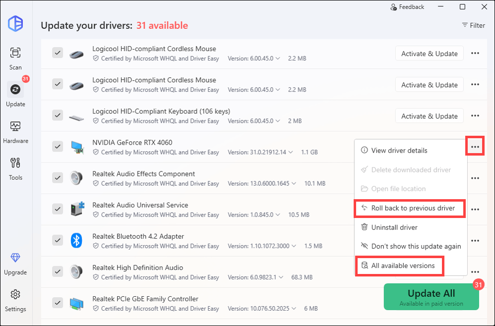 Manual driver updates can be a lot of work. For a better, more convenient way to handle this, you can try Driver Easy. Instead of spending hours hunting down the right drivers, Driver Easy does all the heavy lifting for you. It automatically scans your entire computer to identify any outdated, missing, or incorrect drivers, not just for your graphics card, but for every single component. With a single click, it can update all your drivers from its massive database of certified, official drivers. Besides, you can always roll back or choose a specific version to install in case the latest one doesn’t work properly for you.