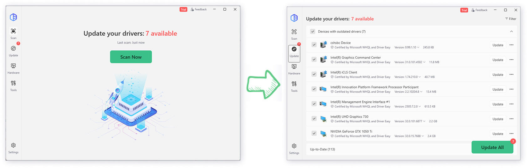 Sign up for our 7-day free trial, and you can experience the full benefits of Driver Easy Pro at no cost. It will identify all your missing or outdated drivers and allow you to download and install them automatically with just one click.
