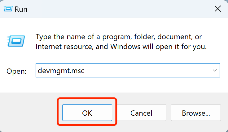 and R at the same time to invoke the Run box.Type devmgmt.msc and click OK.