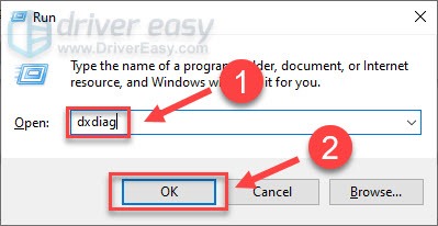 - On your keyboard, press the Windows logo key and R at the same time to invoke the Run box. Then, type dxdiag and click OK.