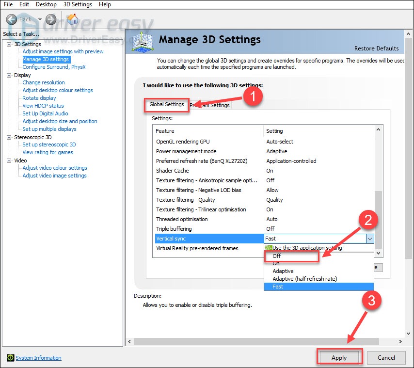 - Choose Global Settings, then find Vertical sync and click the drop-down menu on the right. Select Off and click Apply.