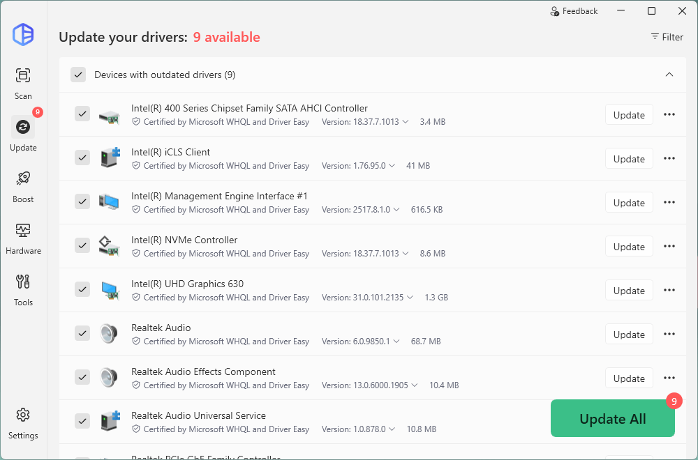 - Click Update All to automatically download and install the correct version of all the drivers that are missing or out of date on your system. (This requires the Pro version – you’ll be prompted to upgrade when you click Update All. If you’re not ready to buy the Pro version, Driver Easy offers a 7-day free trial which includes access to all the Pro features such as high-speed download and one-click install. You won’t be charged anything until your 7 day trial has ended.)