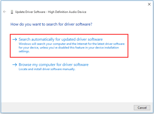 3. In the pop-up window, you will see two options. Click the first option Search automatically for updated driver software. Then Windows will find and install drivers for your video device automatically.