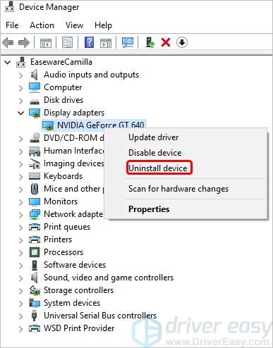 - Double-click Display adapters, right-click your NVIDIA graphics card, then select Uninstall device.