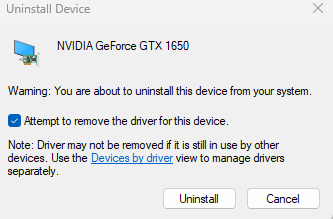 - On Windows 11, the message is different, but still, you just need to tick the box for Attempt to remove the driver for this device and click Uninstall.