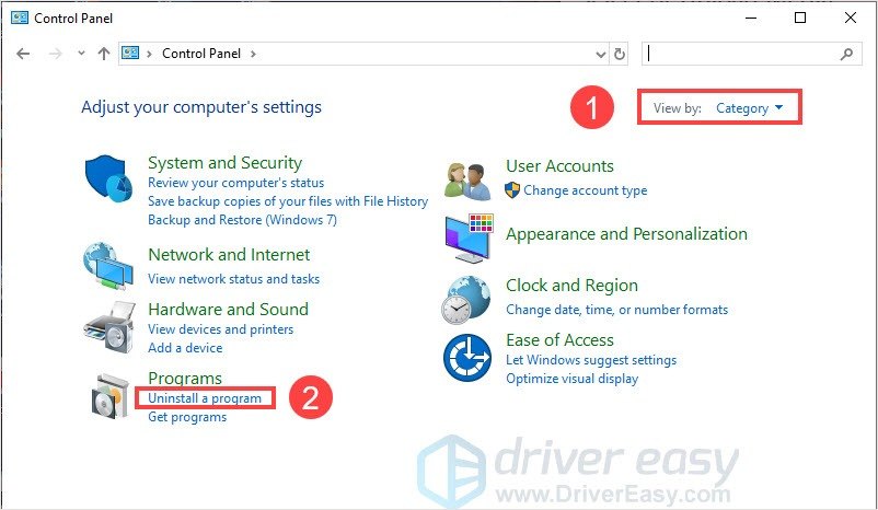 - Set Control Panel view by Category and click Uninstall a program.