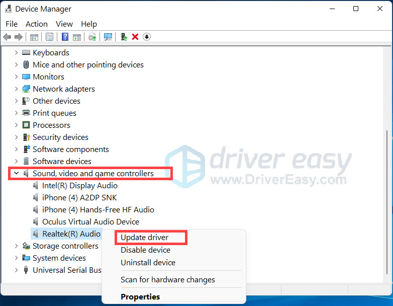 - Expand Sound, video and game controllers. Find Realtek audio and right-click on it. Choose Update driver.