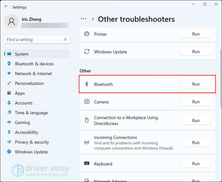 - Find Bluetooth and click Run.