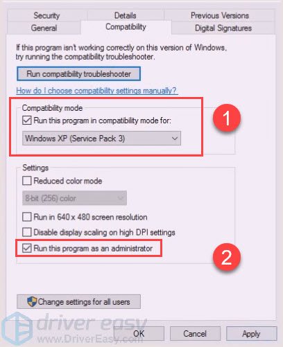 - In the Compatibility tab, tick Run this program in compatibility mode for.