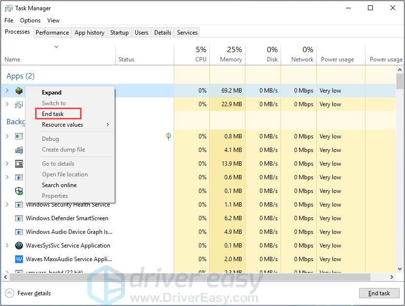 If the launcher closed but not start Minecraft after clicking the Play button, you can open the Task Manager to end the task manually. Reboot Minecraft may fix the won’t launch issue.