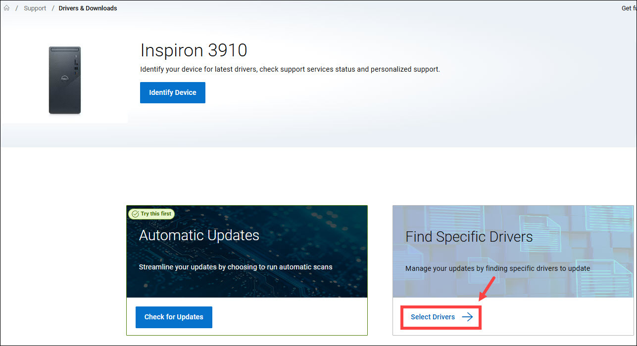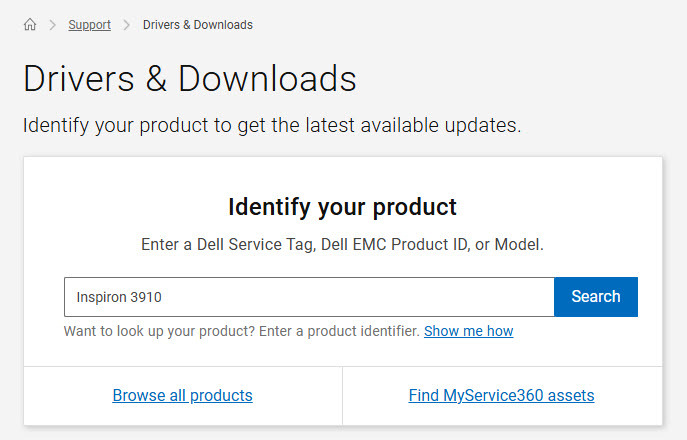 1. Go to Dell Drivers & Downloads page. Input your model (e.g. Inspiron 3910) into the search field and hit Enter.