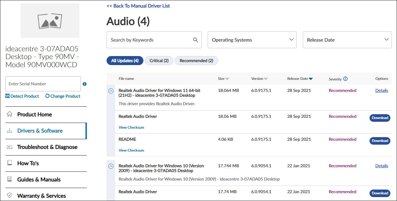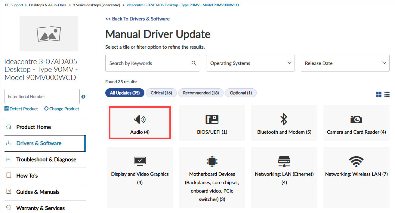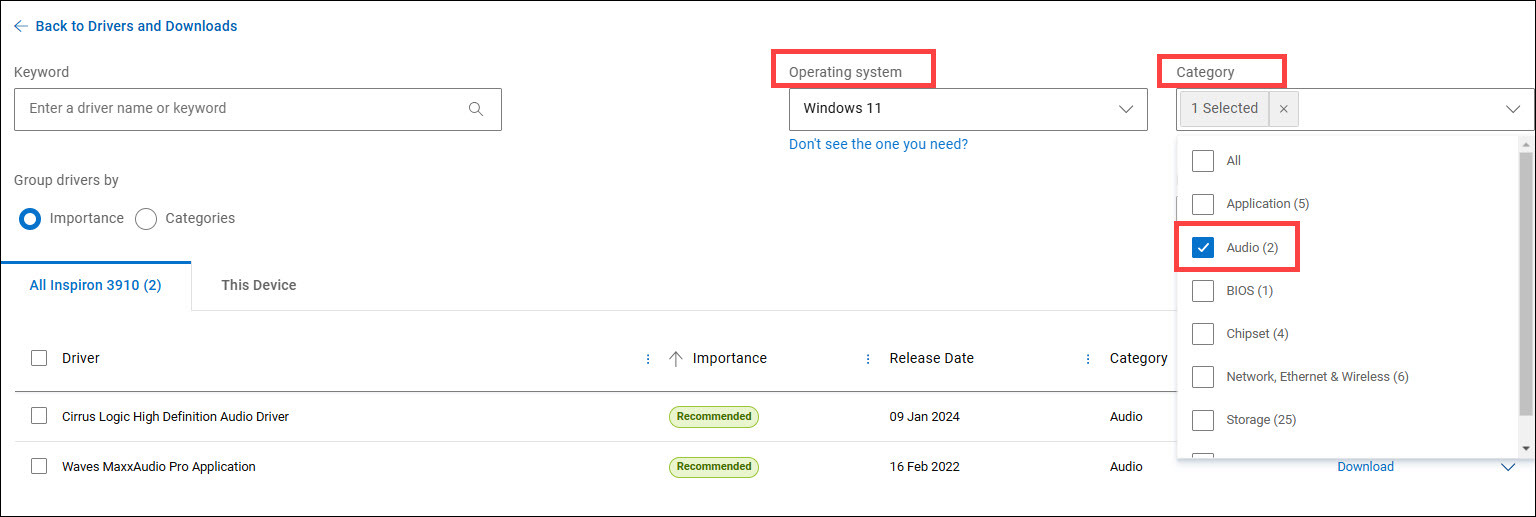3. Select the operating system from the drop-down menu, and select Audio as the Category, or you can simply enter the specific driver name into the search field. Then you should be able to see available audio drivers. Then download the one you need.