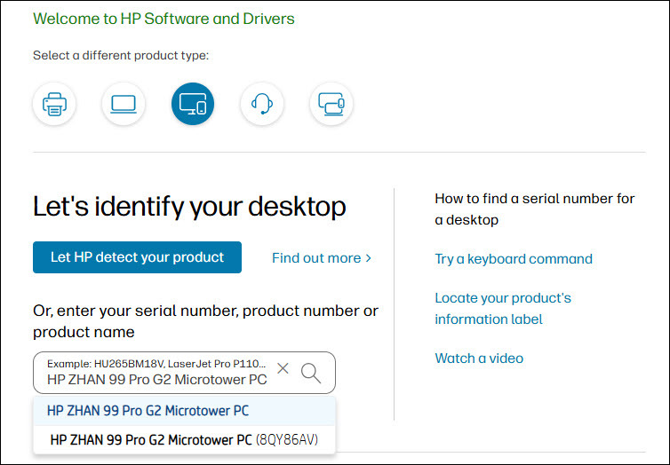 3. Input your model into the search field (e.g. HP ZHAN 99 Pro G2 Microtower PC) and select it when it appears on the search results.