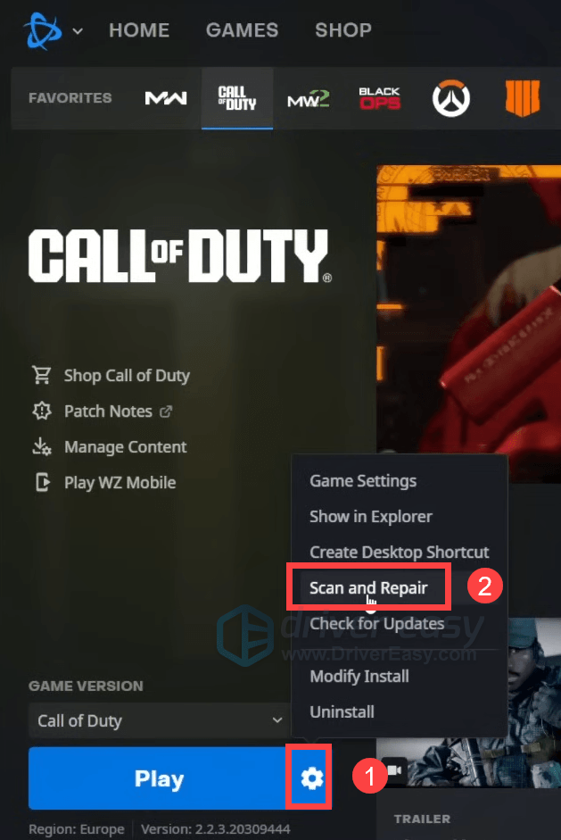 - Click the cogwheel next to the Play button and select Scan and Repair.