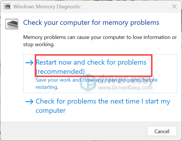 - Click Restart now and check for problems (recommended). Then let the test complete.
